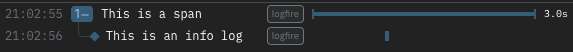 with logfire.span(...):block will be children of that span. This lets you organize your logs nicely in a structured tree. You can also see this parent-child relationship in the console logs based on the indentation. - Spans have a start and an end time, and thus a duration. This span took 3 seconds to complete.