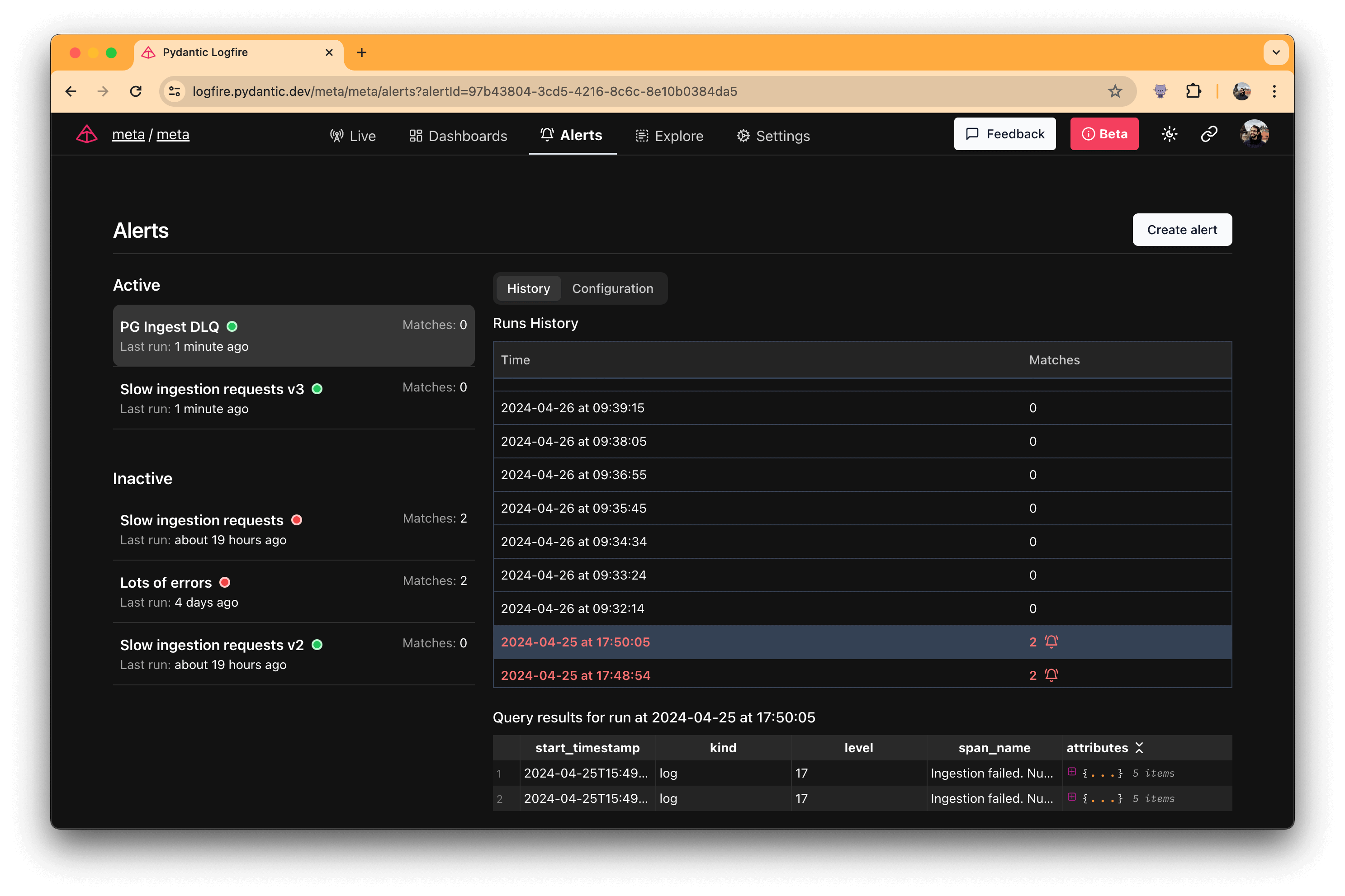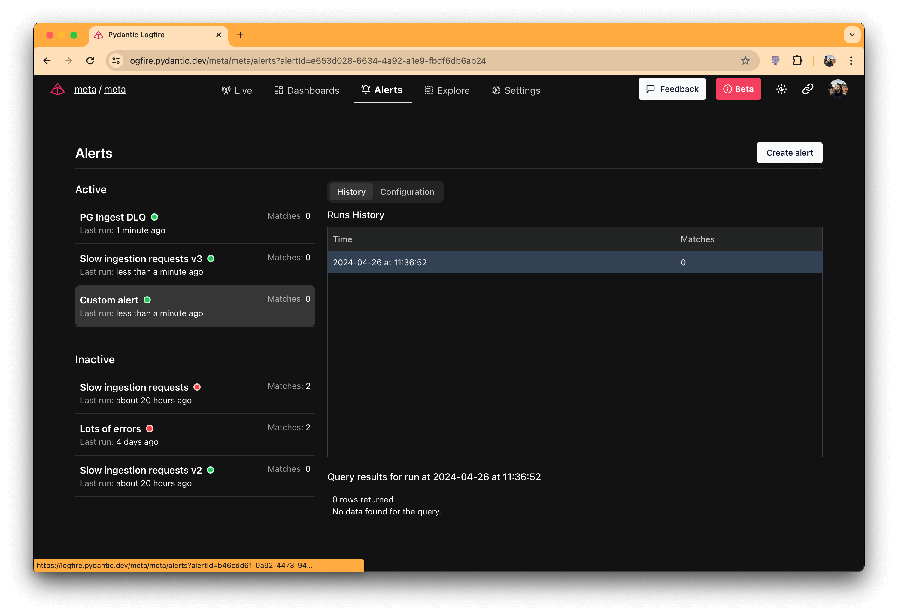 Logfire alerts screen