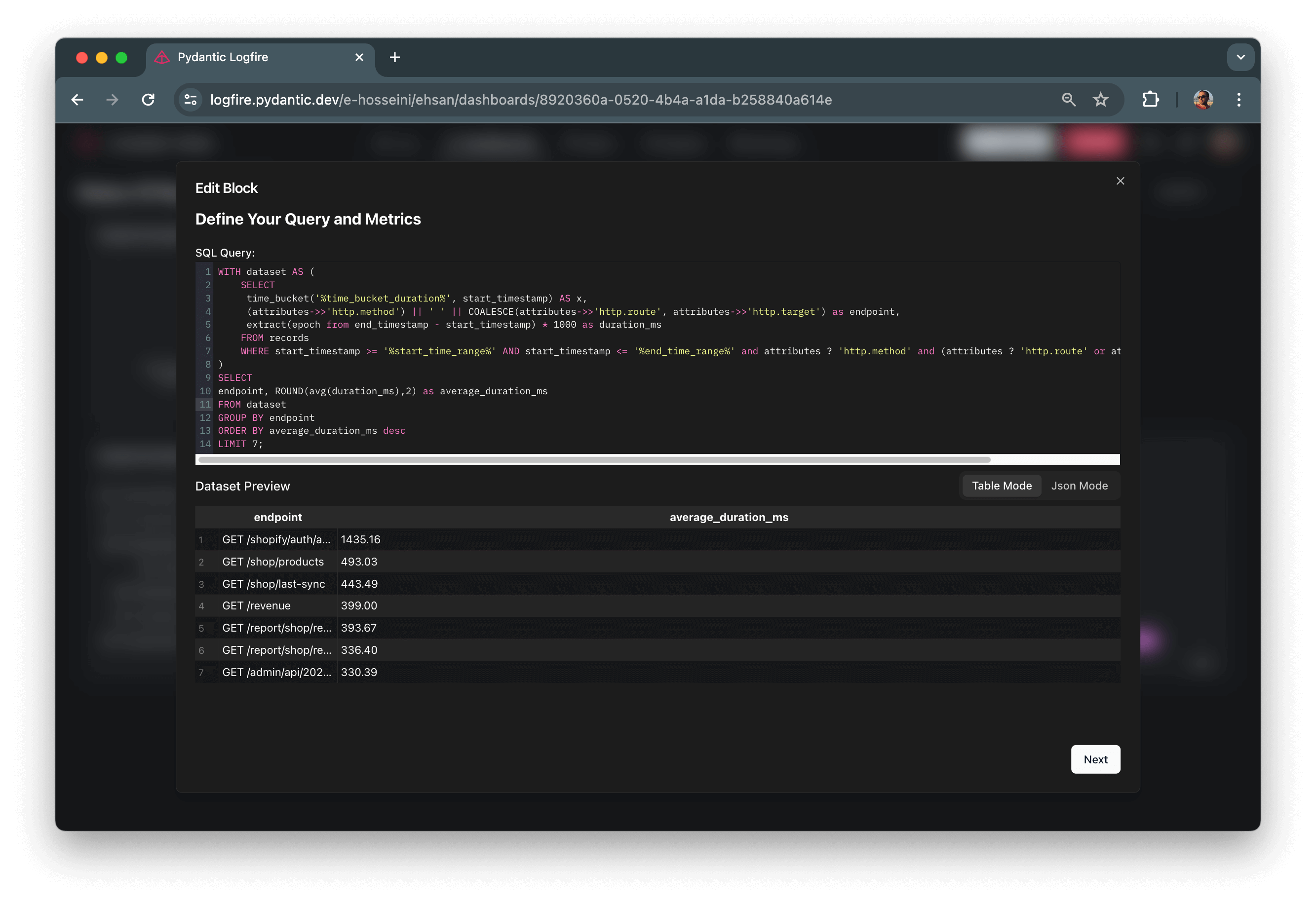 In the second step of creating a chart, you need to input your SQL query. The Logfire dashboard's charts grab data based on this query. You can see the live result of the query on the table behind your query input. You can use the full power of PostgreSQL to retrieve your records.