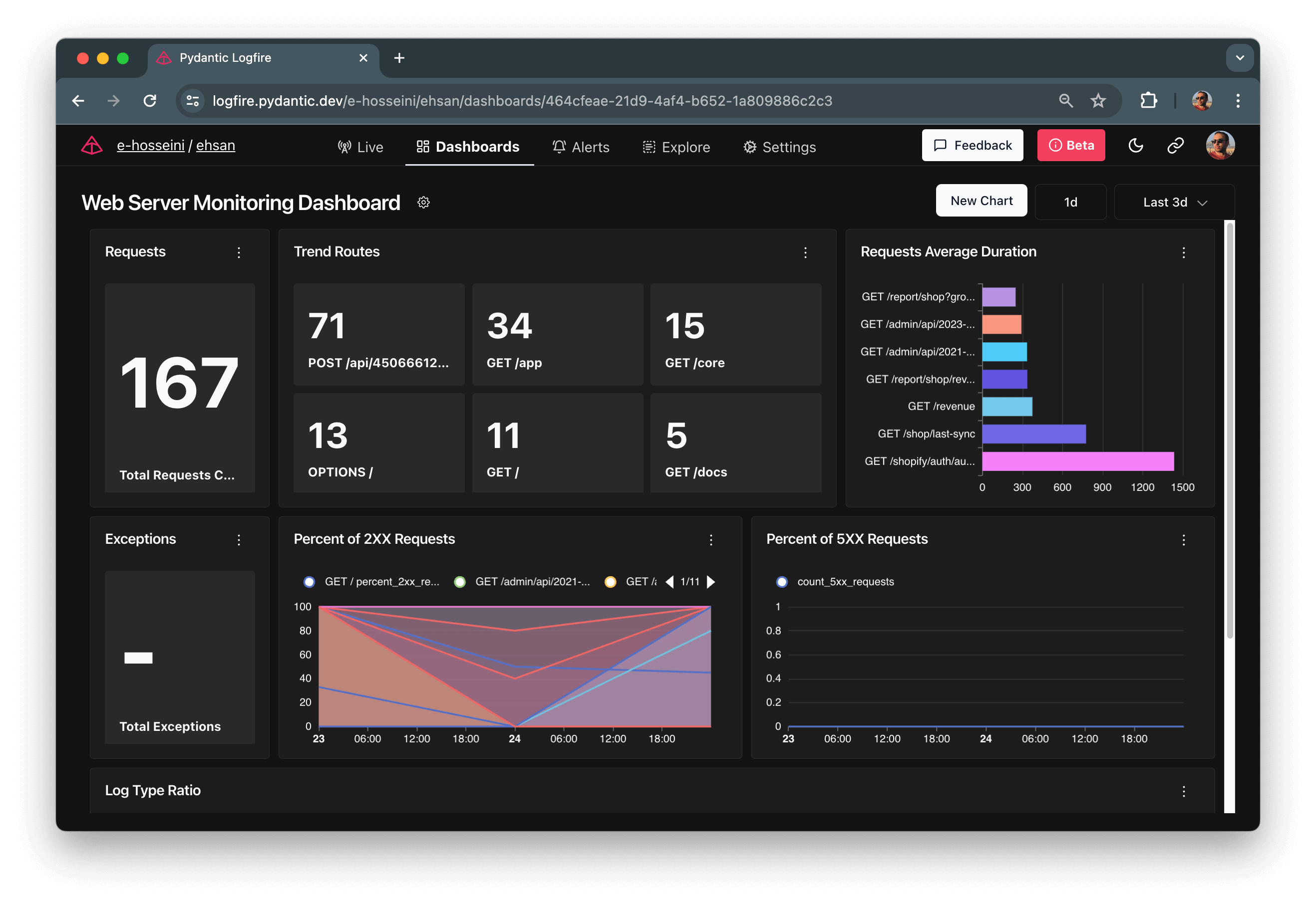 - Log Type Ratio: Breakdown of the different log types generated by your web service (e.g., info, warning, error).