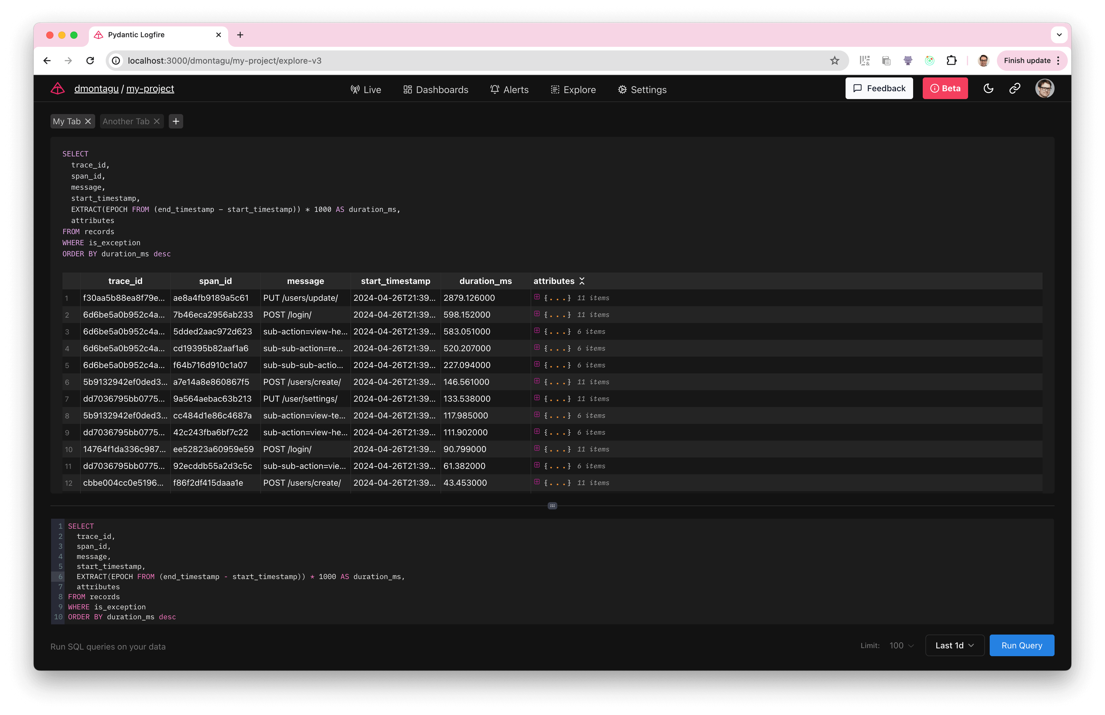 With Logfire, you can use the Explore page to run arbitrary SQL queries against your trace and metric data to analyze and investigate your system.