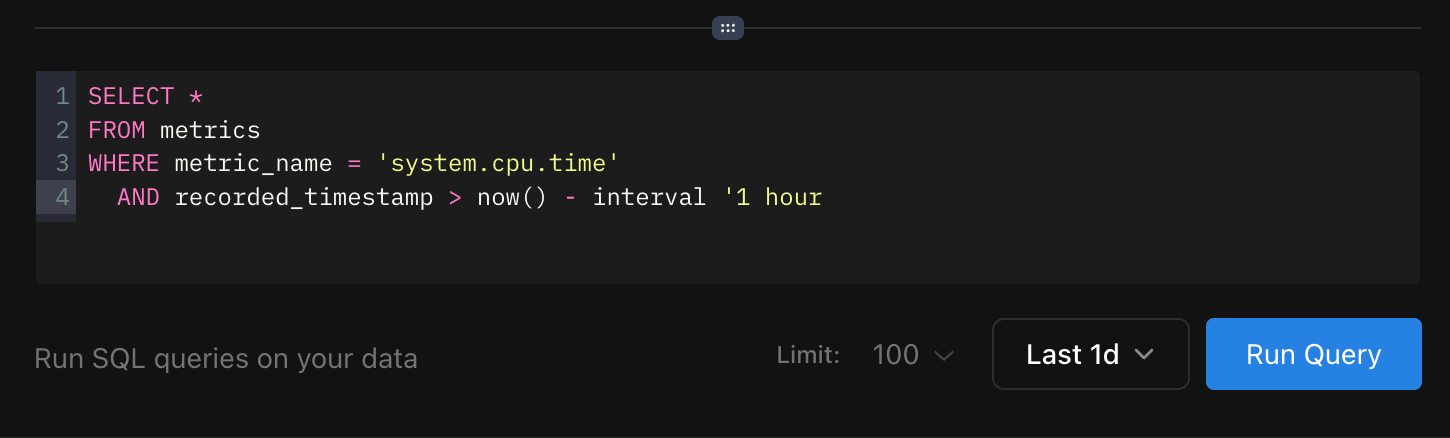 You can query metrics using standard SQL, just like traces. For example: