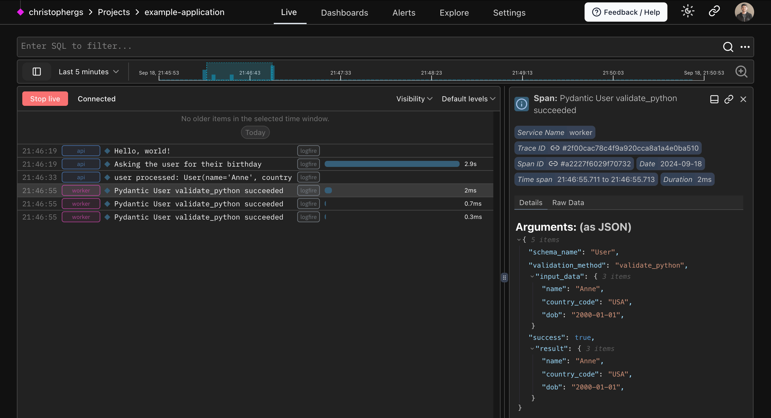 user processed: User(name='Anne', country_code='US', dob=datetime.date(2000, 1, 1)), but also allow you to see a "pretty" view of the model within the Logfire Platform.
